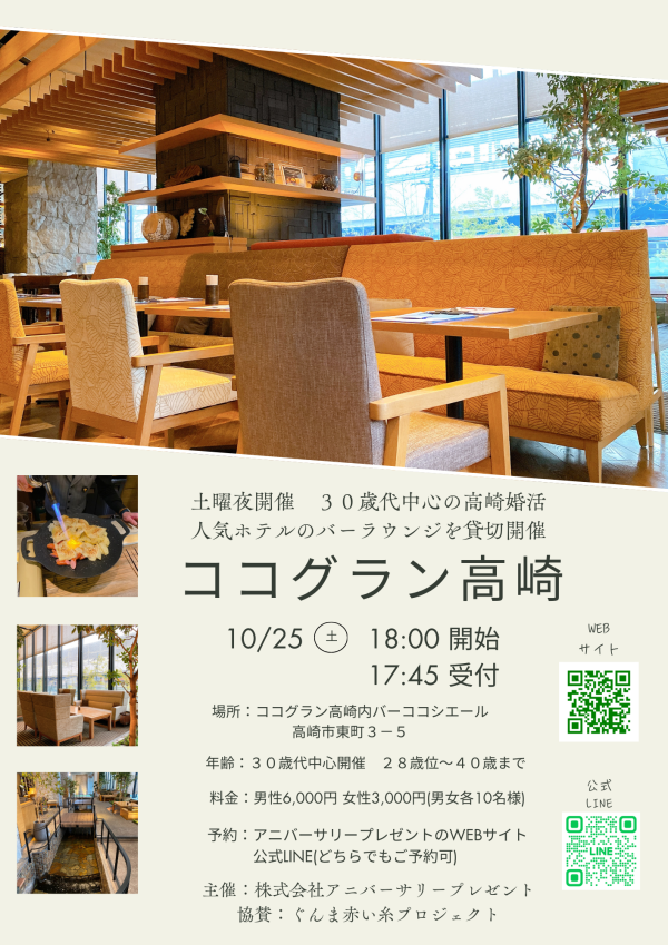 10月25日(土)の18時より、大人気ホテルのココグラン高崎にて、婚活イベントを開催致します。