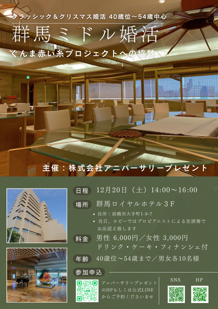 群馬県への協賛・アニバーサリープレゼント主催の12月20日の前橋婚活イベントの詳細は下記の通りになります。