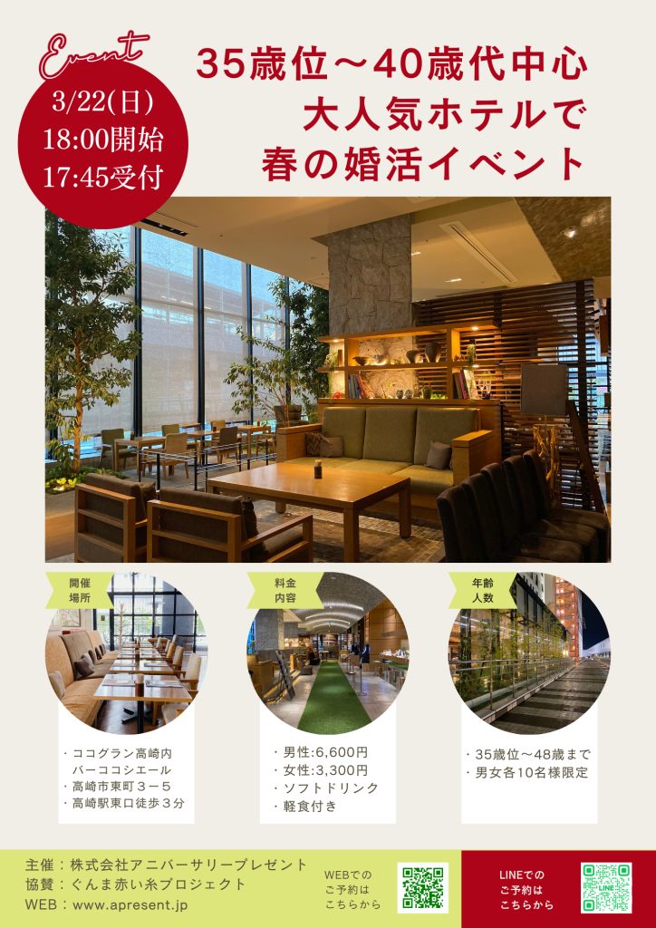 3月22日の18時より、人気ホテルのココグラン高崎のバーラウンジにて、35歳位~48歳中心の婚活イベントを開催致します。