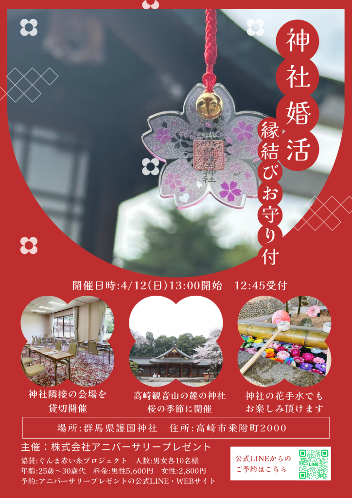 4月12日には、群馬県護国神社での桜の形をした縁結びお守り付きの高崎婚活を開催致します。