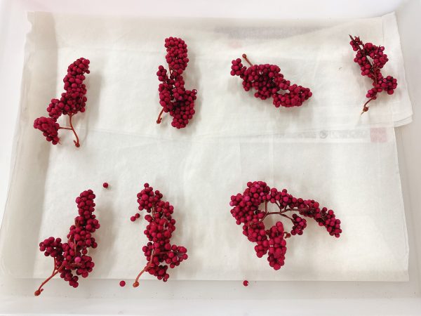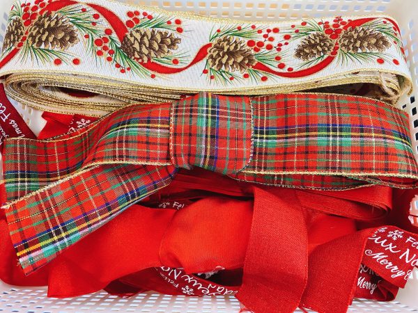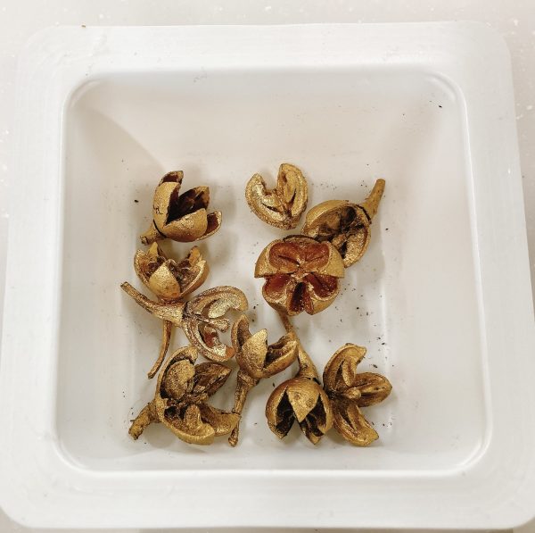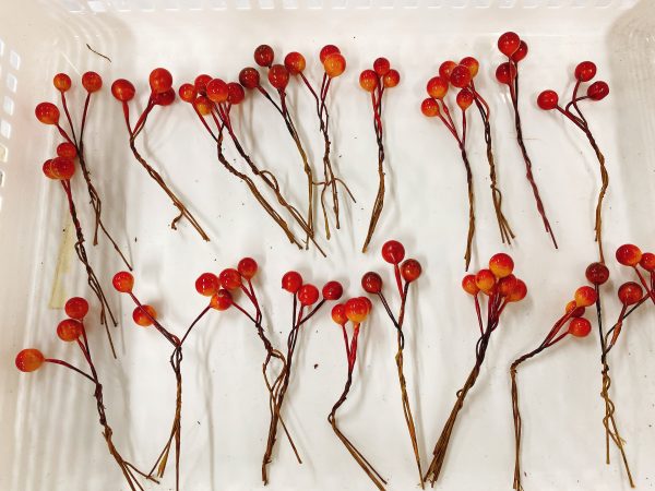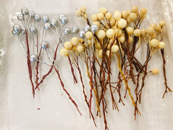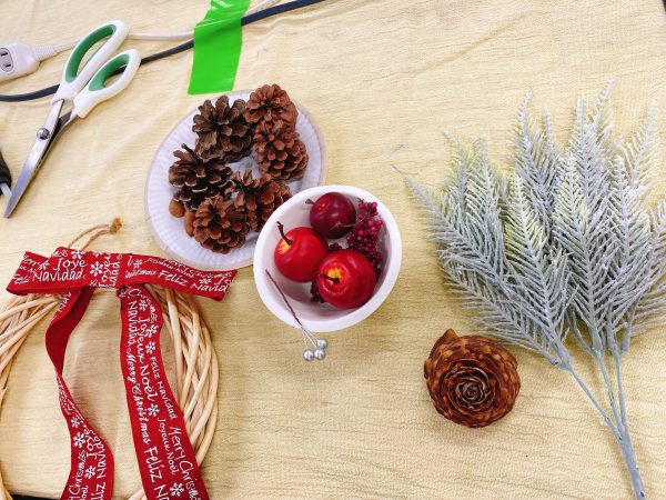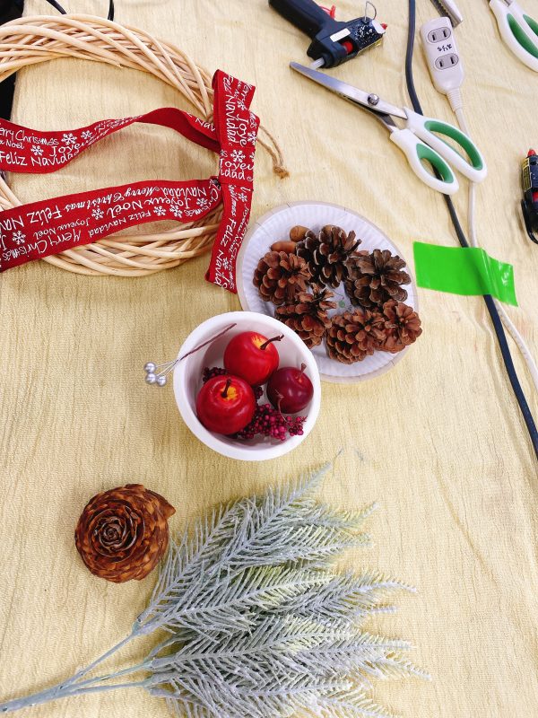グルーガンを使い、花材をつけて、リボンを結んで完成。