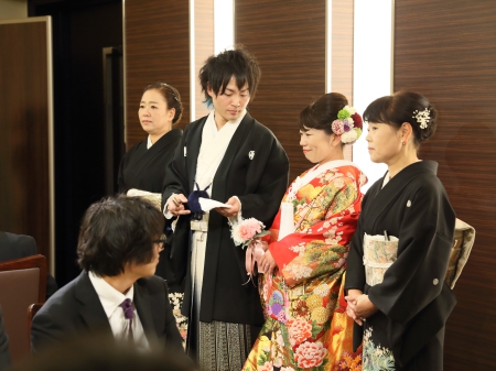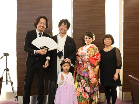紋付袴のコーディネートにもこだわり、羽織紐も好きなカラーのブルーにして、会場装花やブーケ・ブートニア、タキシードもブルーに統一しました。